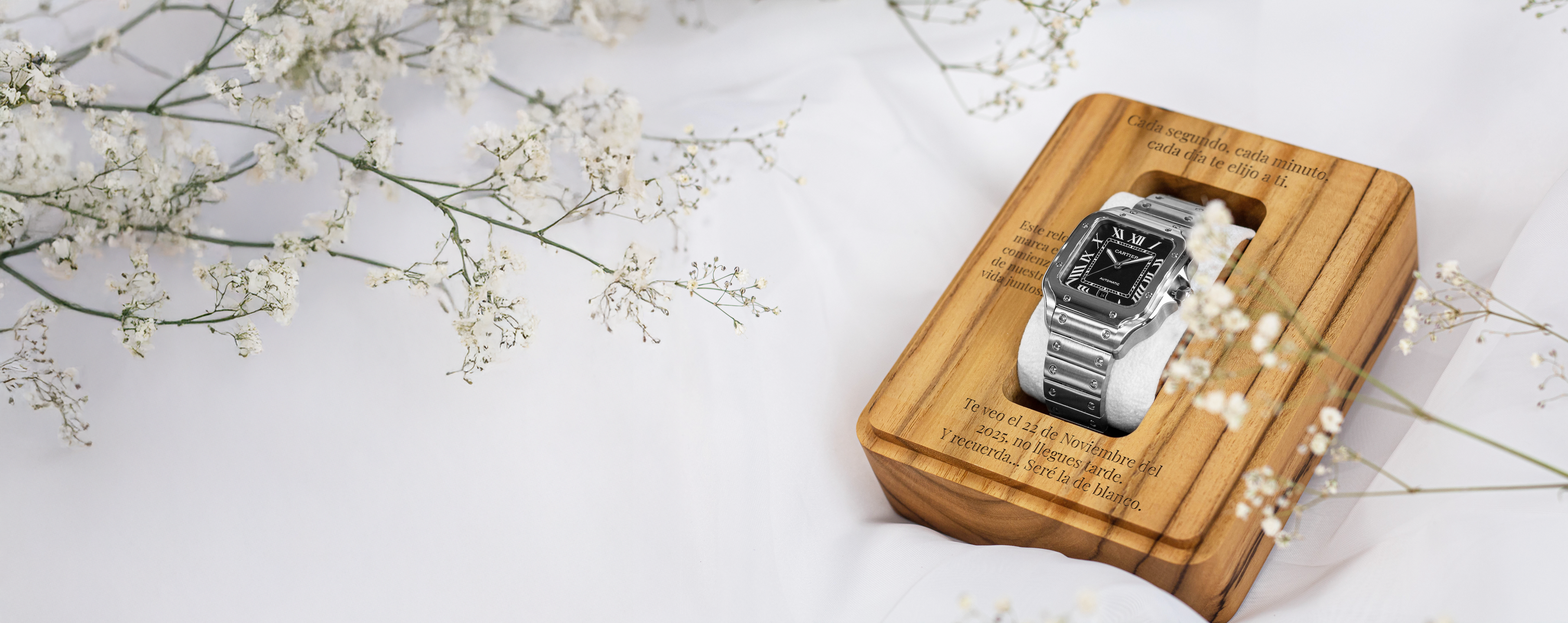El reloj simboliza el tiempo que han recorrido juntos y todos los momentos que aún les esperan. Es una forma de decir: “Te elijo cada día.” Un recordatorio constante de que el amor se construye con tiempo, compromiso y pequeños grandes detalles.