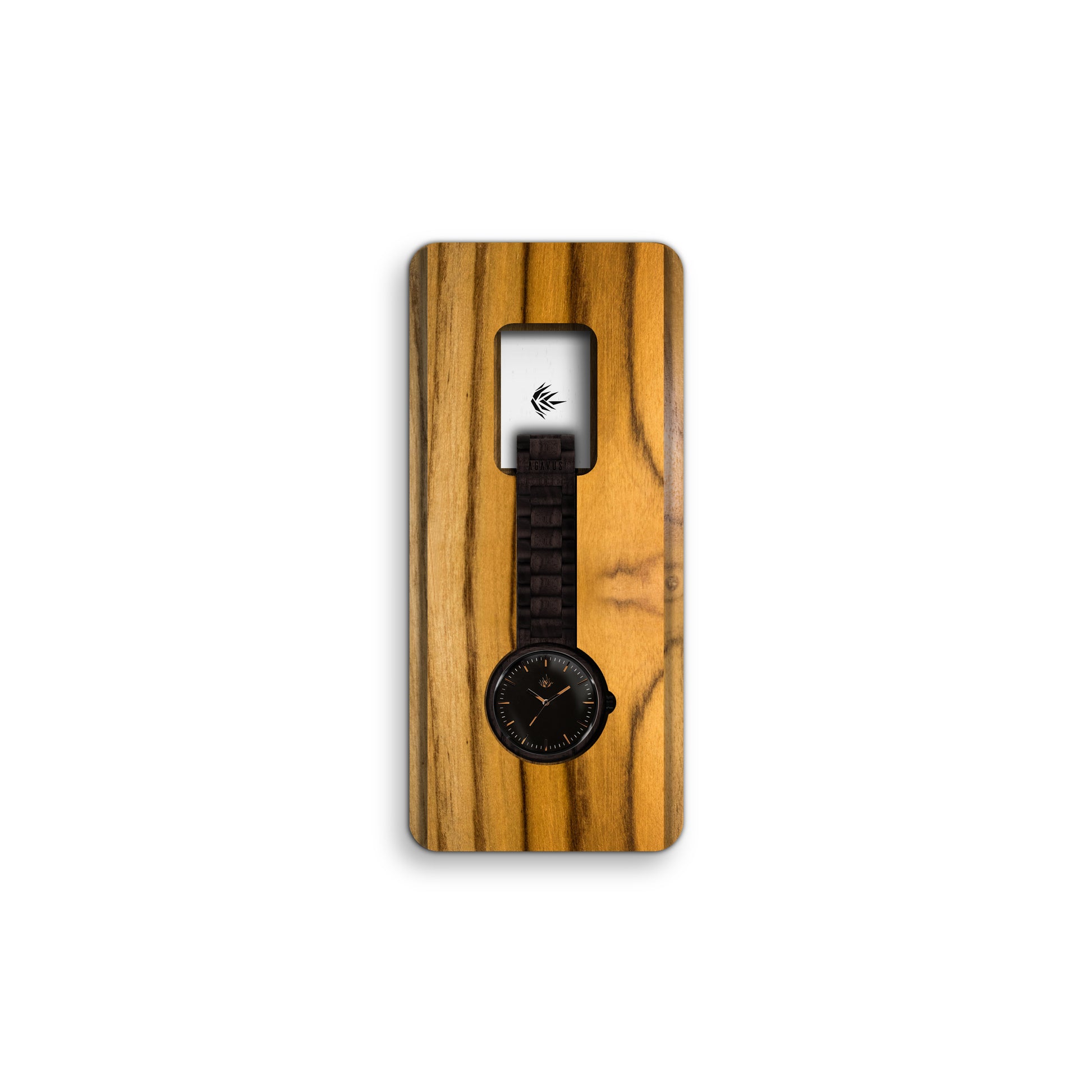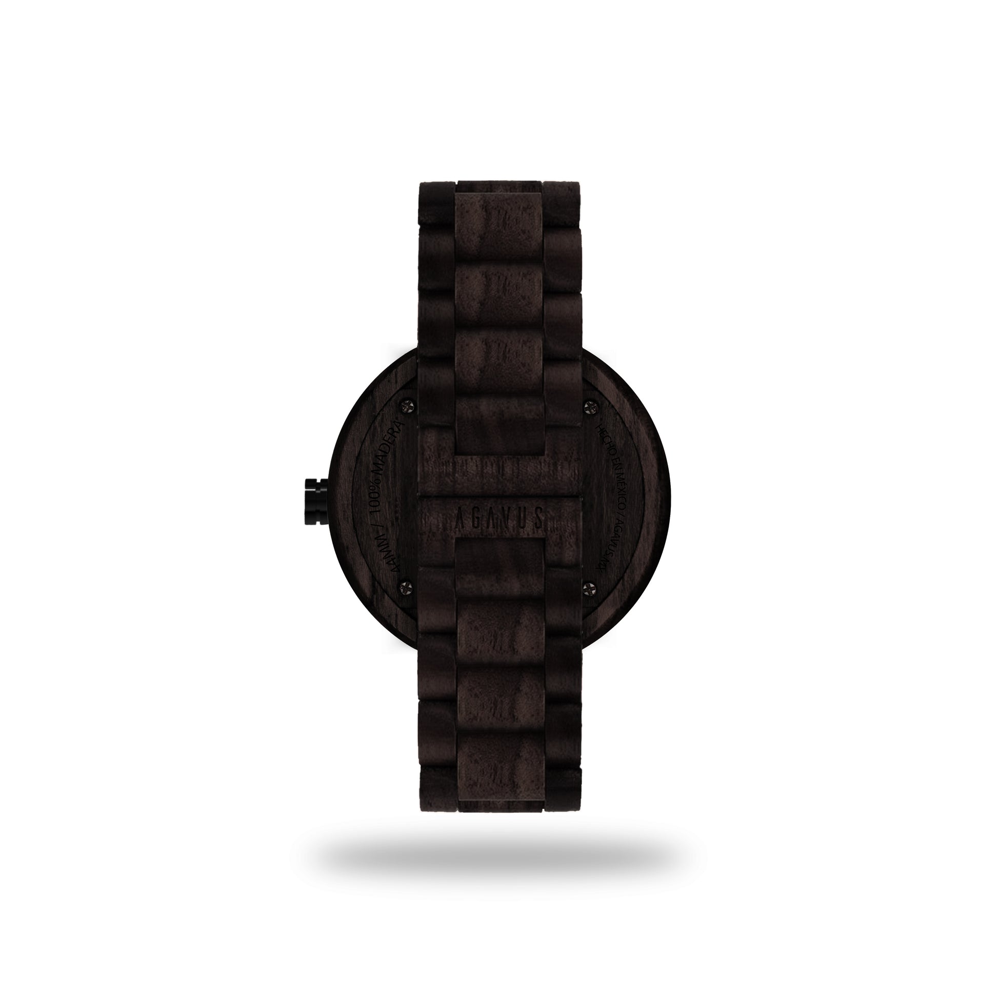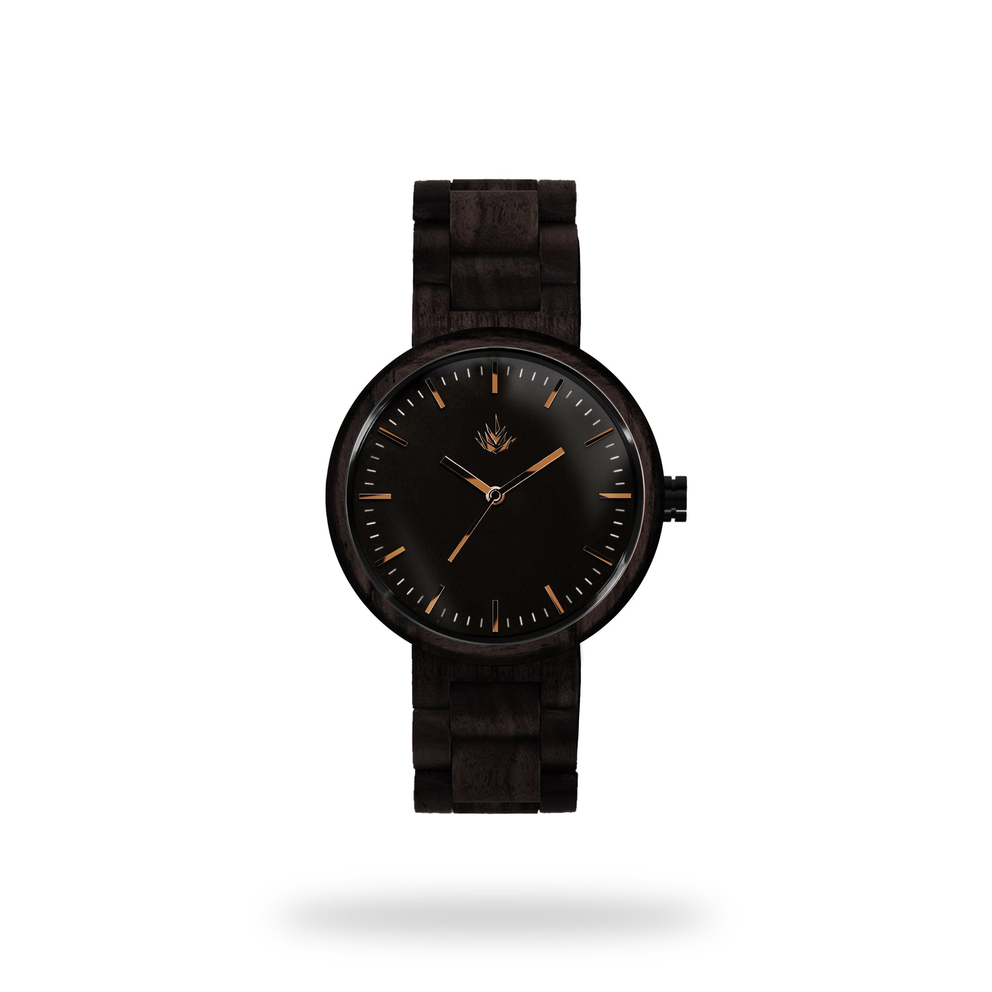 Nuestra línea Edición Especial fué diseñada en 3d, maquinado en una pieza sólida de madera 100% natural con CNC router, y cuidadosamente lijado a mano. En madera de Ébano, carátula en color negro mate, todos sus detalles en acero inoxidable color bronce.