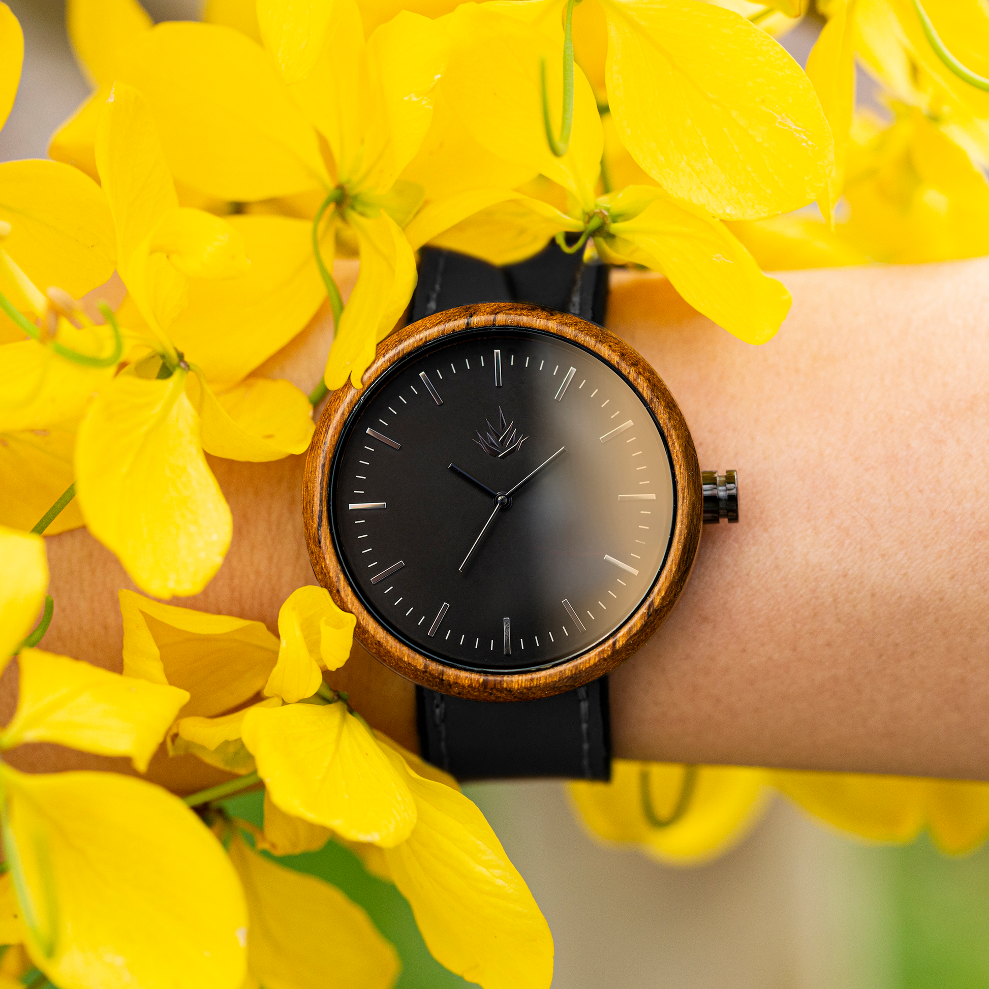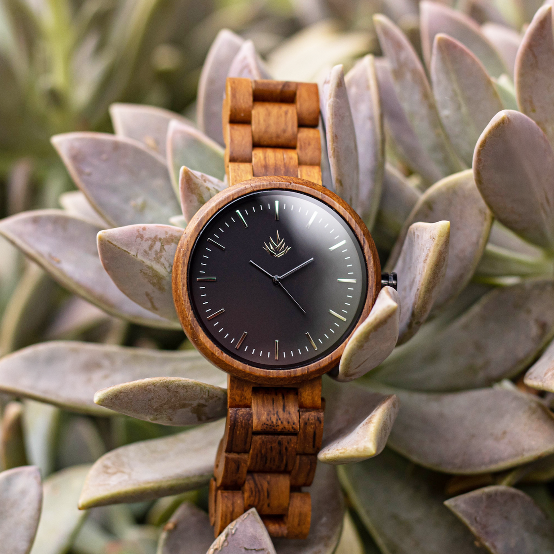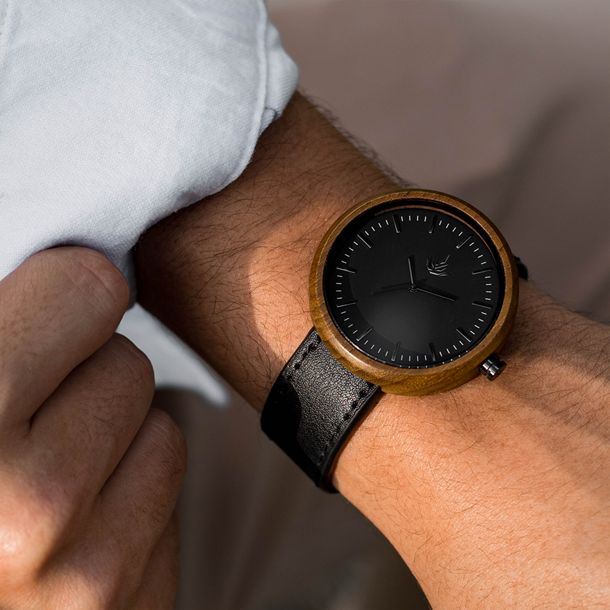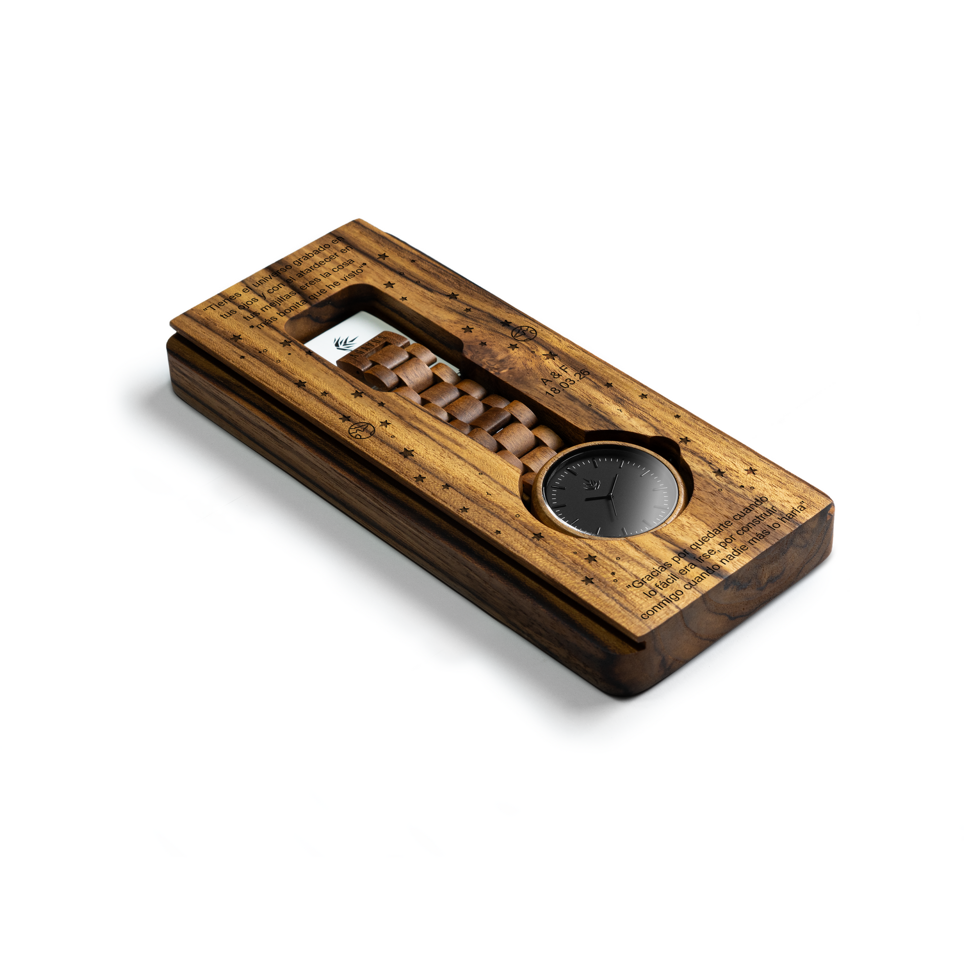 Correa 20mm (44mm) y 18mm (37mm) — Eslabones en madera de Teca con broche mariposa en acero inoxidable, o Piel de Nopal con hebilla en acero inoxidable 316L color negro cepillado