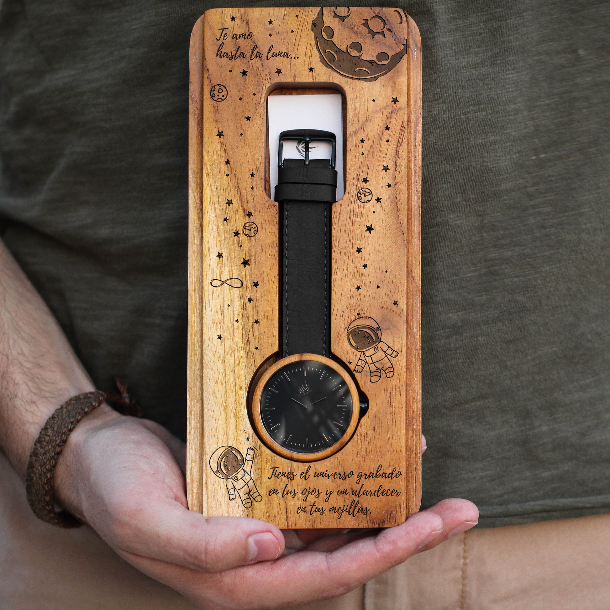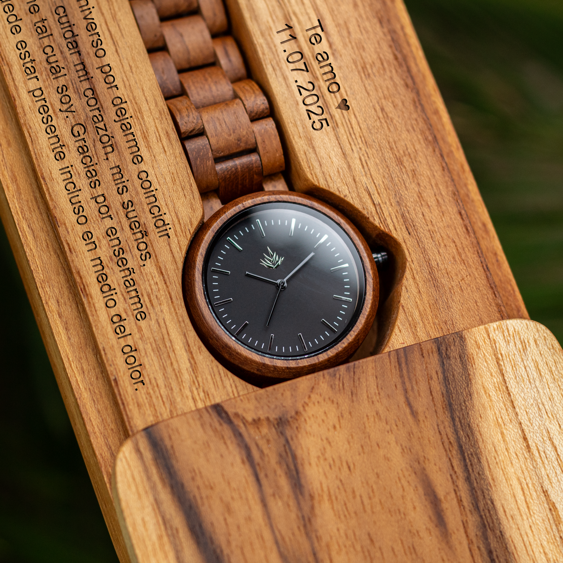 Todos nuestros productos incluyen su personalización. Graba un mensaje, iniciales, fechas, nombres, logotipos o hasta imágenes sin costo adicional. En tu reloj y estuche de madera.