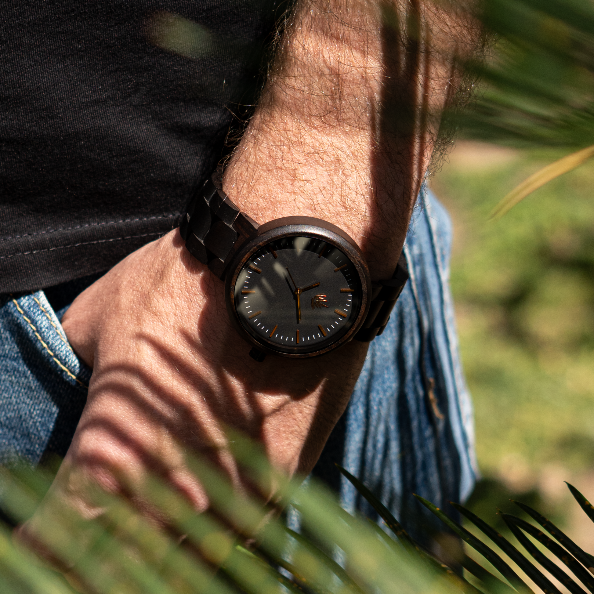 Correa 20mm (44mm) y 18mm (37mm) — Eslabones en madera de Ébano Africano con broche mariposa en acero inoxidable, o Piel de Nopal con hebilla en acero inoxidable 316L color negro cepillado