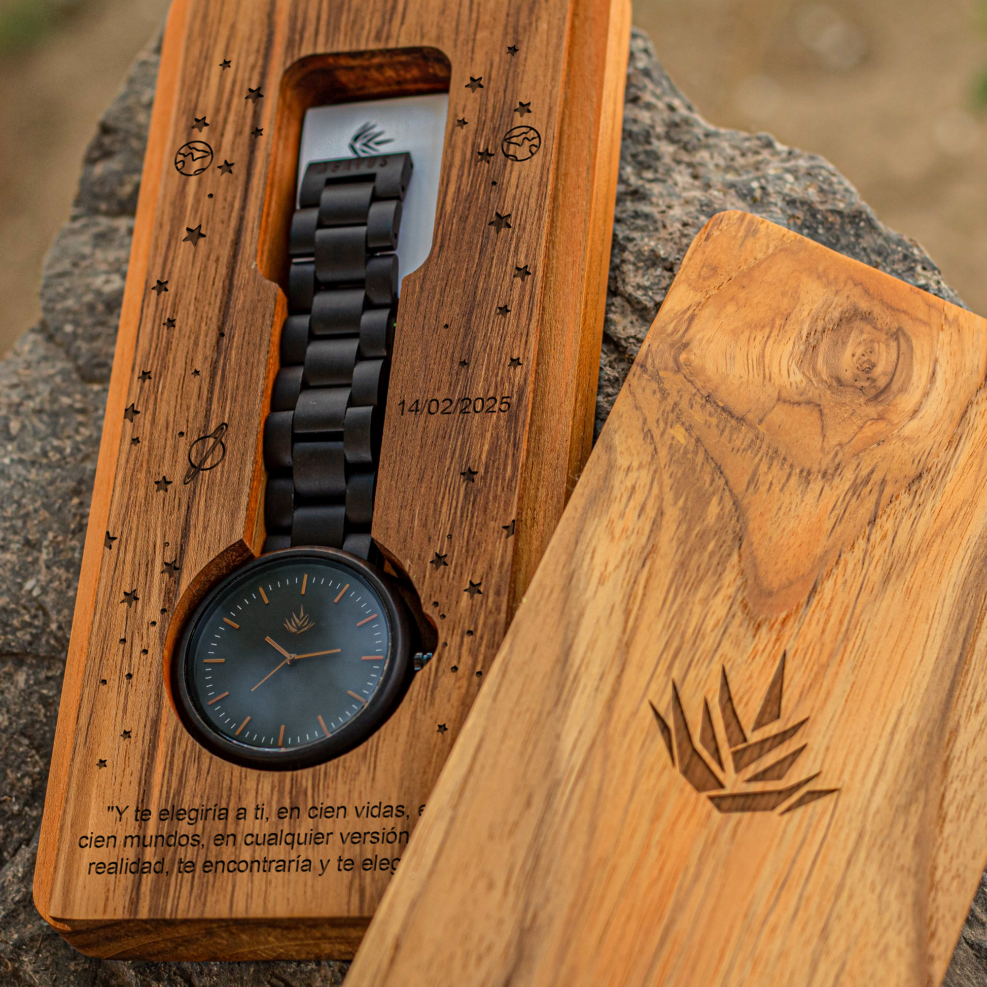 Todos nuestros productos incluyen su personalización. Graba un mensaje, iniciales, fechas, nombres, logotipos o hasta imágenes sin costo adicional. En tu reloj y estuche de madera.