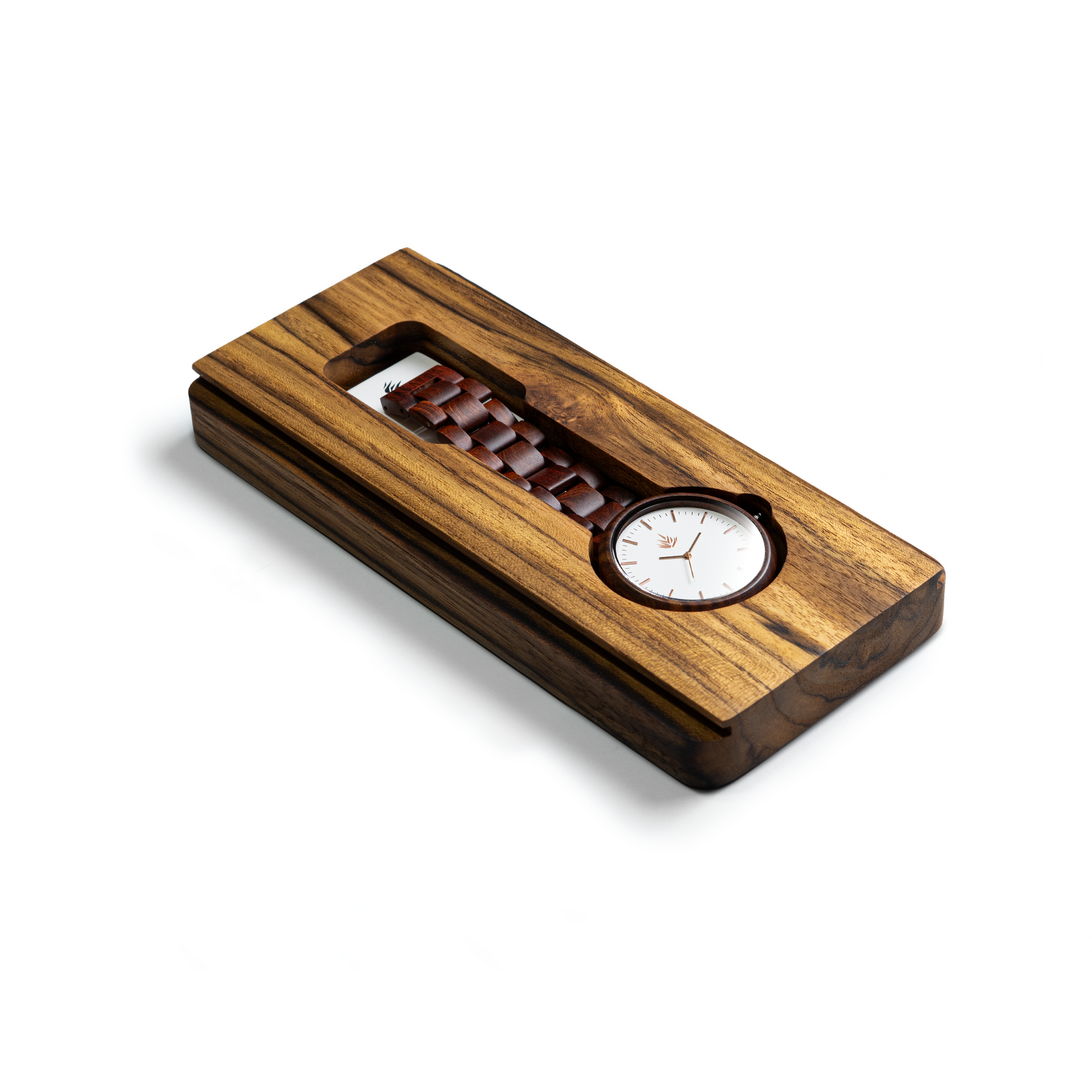 Correa 20mm (44mm) y 18mm (37mm) — Eslabones en madera de Sándalo Rojo con broche mariposa en acero inoxidable, o Piel de Nopal con hebilla en acero inoxidable 316L color negro cepillado