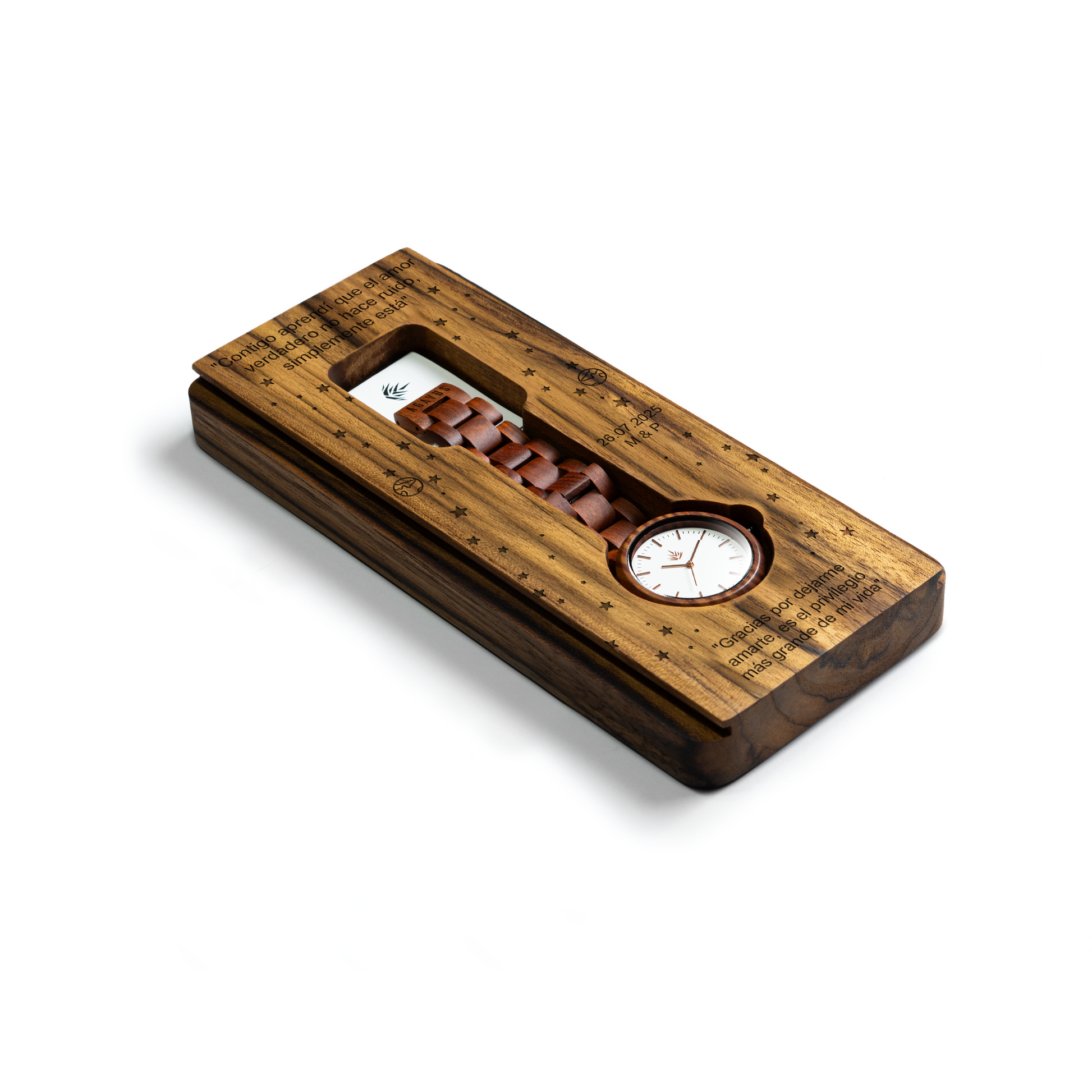 Todos nuestros productos incluyen su personalización. Graba un mensaje, iniciales, fechas, nombres, logotipos o hasta imágenes sin costo adicional. En tu reloj y estuche de madera.